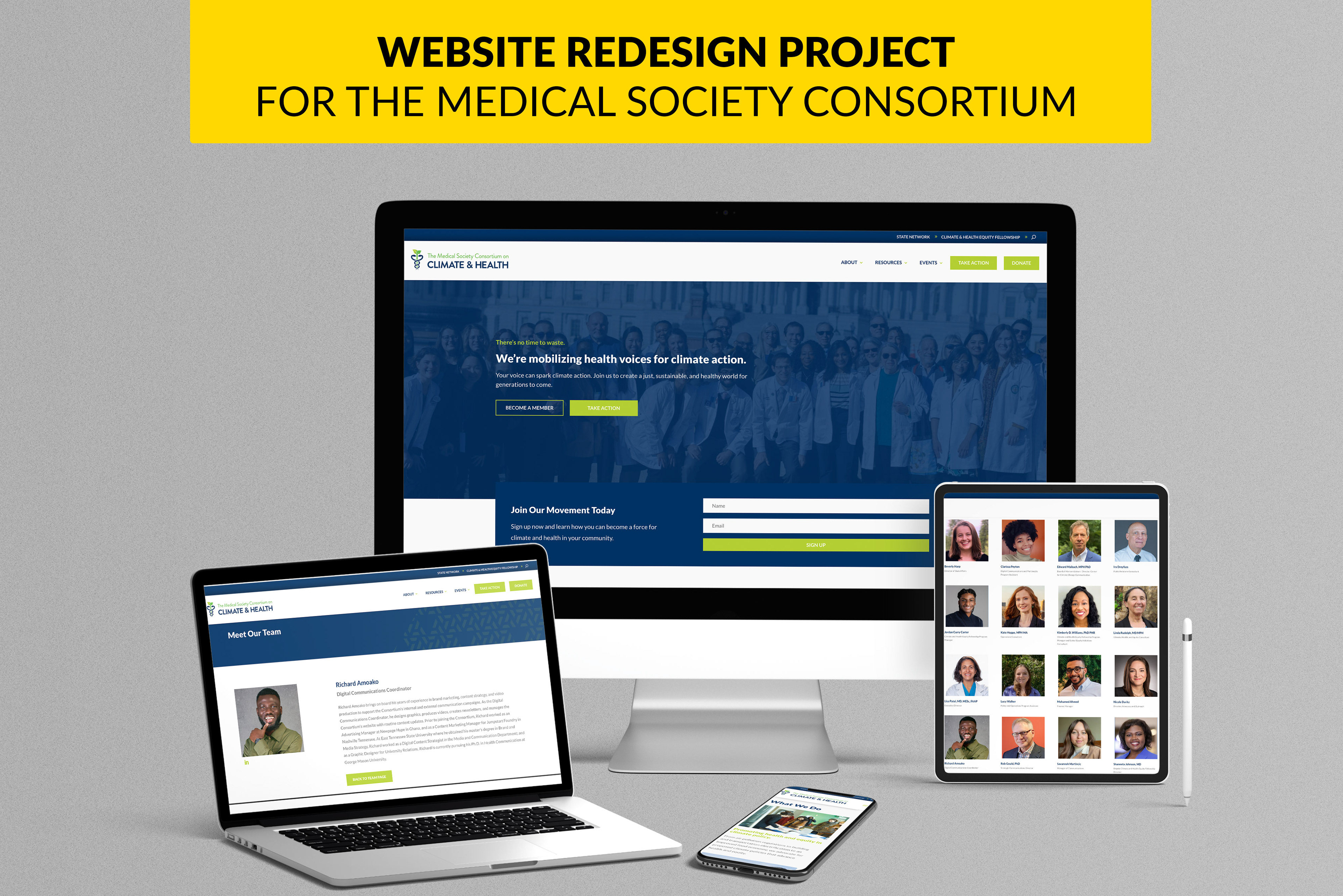 I led a complete WordPress website redesign for Medical Society Consortium on Climate and Health. I scouted a design agency, developed the site map, and collaborated with the communications team to oversee design, review, and approve webpages. I led strategy, information architecture, copywriting, graphic design and selection of imagery for the website.